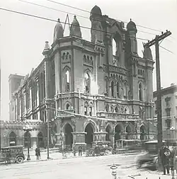 City Hall was demolished in a fire that began about 8 p.m. on January 12, 1921.[1] At the time, about 100 people were attending a basketball practice inside, and others were attending a meeting of City Council at the same time. There were no injuries during the incident. James Thurber, later known for his cartoons, was covering the City Council meeting as a Columbus Dispatch reporter.[6] Sixteen engine companies and six truck companies arrived to fight the fire, setting numerous hoses onto the fire by 8:30 p.m. from multiple areas, including from atop the roof of the Grand Theater building.[1]
