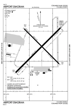 Columbus Municipal Airport covers 2,000 acres (810 ha) at an elevation of 656 feet (200 m). It has two concrete runways: 5/23 is 6,400 by 150 feet (1,951 x 46 m) and 14/32 is 5,000 by 100 feet (1,524 x 30 m).[1]