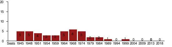 In 1964, the United States State Department estimated the party membership to be approximately 500.[3] In legislative elections held in the same year, the party registered 10.4% of the vote, and won five of the Chamber of Deputies' 56 seats. The party's representation in the Chamber peaked at the following election, with six deputies, but fell, until the KPL lost its last remaining deputy in 1994. In the same year a minority opposing the Marxist-Leninist line of the party split and founded the New Left (Luxembourgish: Nei Lénk) together with the rest of the Revolutionary Socialist Party (Luxembourgish: Revolutionär Sozialistesch Partei).
