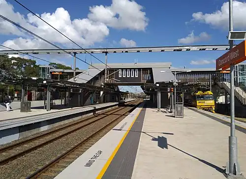 A fourth track was laid to the east of the existing tracks as part of the Northern Sydney Freight Corridor project. As part of these works, Concord West received an Easy Access upgrade and an additional platform. A new overhead concourse with lifts opened on 26 October 2014, replacing the existing concourse.[7][8] The existing eastern platform was converted to an island platform. The new platform (numbered 1) opened on 9 June 2015 and the existing platforms were renumbered.[9][10]