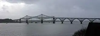 The Conde B. McCullough Memorial Bridge, is a cantilever bridge that spans the Coos Bay on U.S. Route 101 near North Bend, Oregon. When completed in 1936 it was named the North Bend Bridge. In 1947, it was renamed in honor of Conde B. McCullough who died on May 5, 1946. This and ten other major bridges on the Oregon Coast Highway were designed under his supervision.