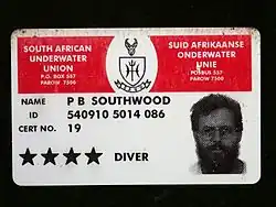 CMAS four-star diver certification card issued by South African Underwater Union, the South African affiliate in the 1980s, which later became the South African Underwater Sports Federation and CMAS Instructors South Africa, the current South African federations.