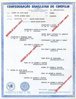The confederation promotes events such as training shows for purebred dogs, work tests for trained dogs, agility, etc., and paid services such as kennel registration, pedigree (the blue one) issuing to dogs of pure breeds recognized by the system which the confederation represents (the FCI), and issuing of the so-called Certificate of Racial Purity (CPR - Certificado de Pureza Racial)[2] which was called single register (RI - Registro Inicial) and is a registration document (the brown one) granted for dogs without any known pedigree which are approved by the visual evaluation of three judges in cases where the dog's anatomy is in accordance with what is described in the official standard of the breed.[3]