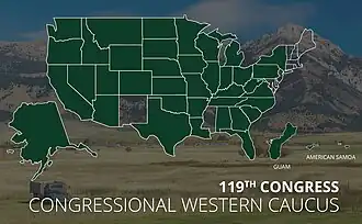 The Congressional Western Caucus is a caucus within the United States House of Representatives composed of over 90 members. Although it has historically been bipartisan, it is currently composed almost exclusively of Republicans.[1] It was founded by then-representatives James V. Hansen (R-Utah), Bob Stump (R-Arizona), Joe Skeen (R-New Mexico) and Barbara Vucanovich (R-Nevada) in 1993 during the 103rd United States Congress. Despite its name, the Congressional Western Caucus has members from outside the Western United States, including as far east as New York City and Puerto Rico.