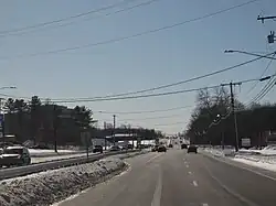 Route 15 continues onto a four-lane arterial road concurrent with US 5, known as the Berlin Turnpike, running between Silver Lake to the west and Lamentation Mountain to the east. Here, it passes along a commercial strip before passing areas of residence. The highway enters the town of Berlin and Hartford County, and briefly forms the western edge of Lamentation Mountain State Park, before heading back into commercial areas. An old alignment of the Berlin Turnpike, splits to the west, while US 5/Route 15 curve to their interchange with the Route 9 freeway and Route 372, in which all access besides the ramps from US 5/Route 15 to southbound Route 9 and from southbound Route 9 to US 5/Route 15 is made via Route 372. North of Route 9, the old alignment of the Berlin Turnpike rejoins the new road briefly, before splitting again, this time to the east. The highway crosses the Mattabesset River before intersecting the western terminus of Route 160. US 5/Route 15 passes rows of shopping centers, as it comes into the town of Newington, intersecting the southern terminus of Route 173, which heads north towards the town of West Hartford. The highway continues to its junction with the southern terminus of Route 176, which heads north towards the center of Newington. A park and ride lot is located in the northeastern corner of this intersection, with Griswoldville Avenue. From here, US 5/Route 15 passes the ConnDOT headquarters on the east, prior to reaching the intersections with Route 287. The highway leaves Newington at its interchange with Route 175, which heads west towards the center of town and east towards the town of Wethersfield.[4]