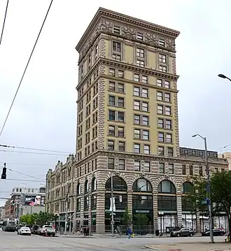 Erected just eight years after Dayton's first skyscraper,[4] the Conover Building stands thirteen stories tall. Its bottom four stories retain a typical commercial design, featuring an arcade, and Baroque styling appears on the top three stories, while the plainer six stories in the middle are distinguished by trabeating at their summit.[3] Situated on the southeastern corner of Third and Main Streets, it lies near the United Brethren Publishing House, the Commercial Building, and the Dayton Arcade.[4]