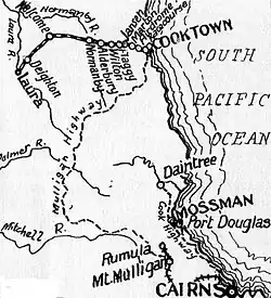 Following the Palmer gold rush of 1873, the largest in Queensland, an isolated line opened between Cooktown and Palmer Road in 1885, and extended to Laura in 1888.[12] The line featured 1 in 25 (4%) grades and construction paused at Laura, junction for the 3 regional tracks, as there was a dispute about the best place to terminate the line, and the preferred alignment would require significant earthworks, including 8 tunnels.