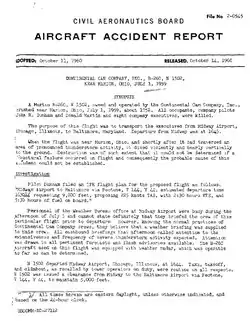 On July 1, 1959, one of the company's executive aircraft, a Martin B-26C, crashed near in Marion, Ohio en route from Midway Airport to Baltimore, killing eight executives and two company pilots. The executives were returning to Continental's New York headquarters after a meeting in Chicago. [4]