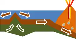 Mantle convection is the slow creeping motion of Earth's rocky mantle caused by convection currents carrying heat from the interior of the Earth to the surface.[33] It is one of 3 driving forces that causes tectonic plates to move around the Earth's surface.[34]