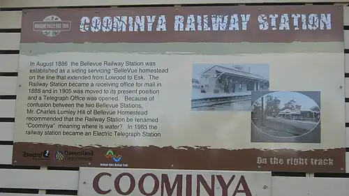 Coominya railway siding came into being on 9 August 1886 and became known as 'Bellevue'.[3] This occurred when the section of the Brisbane Valley railway line from Lowood to Esk which passed through Coominya was officially opened. The original goods platform siding was established over the rise, east of its current site, at the entrance to ‘Bellevue Station’, the cattle selection.