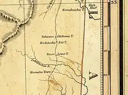 Coosha is listed as "Concha" on Jean Baptiste Bourguignon d'Anville's map of 1732[4] and Baron de Crenay's map of 1733[5] and as "Coosha" on Bernard Romans's map of 1775.[2] On the 1820 map "Louisiana and Mississippi" by Henry Schenck Tanner, it is shown as "Koomsha Town."[6] On John R. Swanton's 1931 map included in his book Source Material for the Social and Ceremonial Life of the Choctaw Indians, the town's name is spelled "Kunshak."