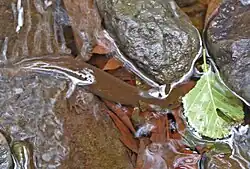 Upper reach wildlife includes the federally listed endangered red-legged frog. Upper reaches of Copeland Creek have a very high percentage population of California bay laurel, and also provide habitat for a rich variety of amphibians, newts and other fauna. The Pacific giant salamander, one of the largest known species of salamander is observed hunting for prey in upper Copeland Creek. Other amphibians seen in upper riparian habitats include the Pacific treefrog, Pseudacris regilla (formerly Hyla regilla), rough skinned newt, Taricha granulosa, and California slender salamander, Batrachoseps attenuatus.