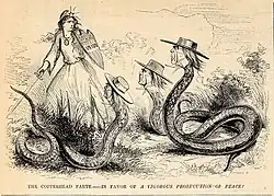 Republicans started labeling anti-war Democrats "Copperheads" after the eastern copperhead (Agkistrodon contortrix), a species of venomous snake. Those Democrats embraced the moniker, reinterpreting the copper "head" as the likeness of Liberty, which they cut from Liberty Head large cent coins and proudly wore as badges.[2] By contrast, Democratic supporters of the war were called War Democrats. Notable Copperheads included two Democratic Congressmen from Ohio: Reps. Clement L. Vallandigham and Alexander Long. Republican prosecutors accused some prominent Copperheads of treason in a series of trials in 1864.[3]