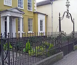 The building now faces Monnow Street. The façade that looks onto the street is Georgian and shows two floors and an attic, with the building being set behind a railed forecourt. The new frontage was added in 1770, and (slightly later) a porch, fanlights and side doors were added in the late 18th century.[2] The house now has five bays, under a cornice and pedimented porch on slender Doric columns.