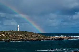 Corny Point is a headland located on the west coast of the Yorke Peninsula in South Australia about 37 kilometres (23 miles) north west of the town of Warooka. The point is described as being "a sloping rocky double projection..." where the "coast on the N[orth] side is low and sandy whereas the coast on the S[outh] side is higher than the point itself."[2] It is the south headland of Hardwicke Bay. It was named by Matthew Flinders on 18 March 1802. The waters adjoining its shoreline are within the Southern Spencer Gulf Marine Park. Since 1882, it has been the site of a navigation aid in the form of a lighthouse.[1][3][4][5][6][7]
