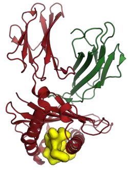 The human HLA-A*0201 (red) and beta-2 microglobulin (green) in complex with a peptide derived from the M protein of SARS-CoV (yellow, shown as surface). From PDB: 3I6G​.[16]