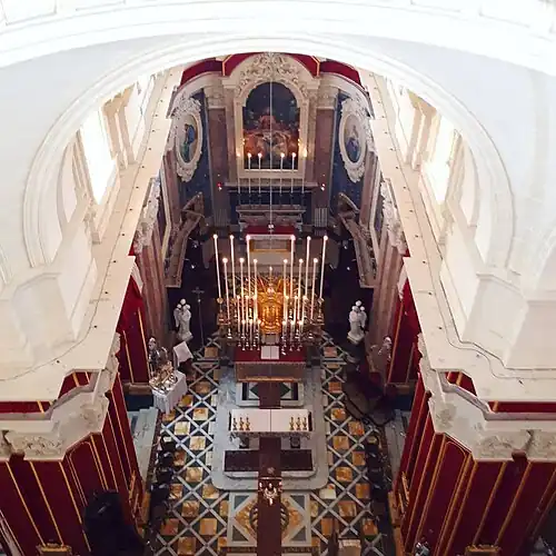 The titular altarpiece is The Last Supper by Lazzaro Pisani and is located in the choir. It was commissioned by the then-curator and vice-parish priest the Rev. Fr. Carmelo Caruana. The painting was installed in 1917. By 2007, due to the weight of the canvas itself, creases were forming in the painting and it was getting unstuck from its frame. BOV sponsored the restoration.[1] The restoration was carried out by Emanuel Zammit, from Żejtun following his other works in the Cathedral of the Assumption in Gozo.[2]