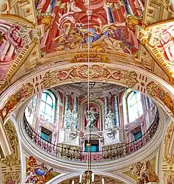 The stone Corpus Christi church was founded by Mikołaj Krzysztof "the Orphan" Radziwiłł, who decided to return it to Catholicism.[3] On August 19, 1584, he signed a document allowing the Society of Jesus to stay in the city of Nesvizh.[4] The architect Giovanni Maria Bernardoni was invited to head the construction of the collegium and the church. He was inspired by the Church of the Gesù in Rome. However, he died in Kraków in 1605 and the dome of the Nesvizh church was completed by his apprentice Giuseppe Brisio. The nave is 17.8 m (58 ft) high and the dome is almost two times higher. The frescoes widely used compositions by Peter Paul Rubens. The first mass was chanted on November 1, 1593.[5][6]