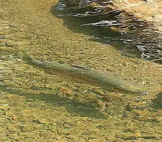 Corte Madera Creek is one of few streams flowing into San Francisco Bay with a steelhead trout (Oncorhynchus mykiss) population. The best spawning gravels are in Upper San Anselmo Creek, Ross Creek, and Sleepy Hollow Creek. Fairfax Creek has a total barrier to fish passage at its confluence with San Anselmo Creek. Larkspur Creek is rumored to have had steelhead long ago, and the occasional steelhead is still seen in Tamalpais Creek. Chinook salmon (Oncorhynchus tshawytscha) currently utilize the watershed.[13]