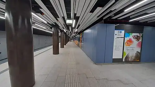 Corvin-negyed is a station on the M3 line of the Budapest Metro. The station opened on 31 December 1976 as one of six stations in the initial phase of construction, between Deák Ferenc tér and Nagyvárad tér.[2] From its opening until 2011, the station was named Ferenc körút after its section of the Grand Boulevard. In 2011, the Corvinus Quarter (Corvin-negyed) was established as a residential and commercial redevelopment area. The city renamed the station after the new district as part of several name changes to metro stations that year.[3]