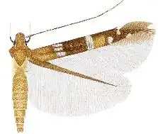 Male. Forewing length 3.7 mm. Head: frons shining grey, in middle a shining white streak, vertex and neck tufts shining bronze brown with some reddish reflection, laterally lined white, collar shining bronze brown; labial palpus first segment very short, white, second segment three-quarters of the length of third, dark brown with white longitudinal lines laterally and ventrally, third segment white, lined brown laterally, extreme apex white; scape dorsally dark brown with a white anterior line, ventrally white, antenna shining dark brown with a white interrupted line from base to two-fifths with a short uninterrupted section at base, two indistinct subapical greyish rings of two segments each, separated by two dark brown segments at three-quarters, apical part of eighteen segments greyish brown. Thorax and tegulae shining bronze brown with reddish gloss. Legs: shining dark brown, femur of hindleg shining golden, foreleg with a white line on tibia and tarsal segments one and two, segment four with a white apical ring, segment five entirely white, tibia of midleg with silvery white oblique basal and medial lines and a white apical ring, tarsal segments one, two and four with white apical rings, segment five dorsally white, tibia of hindleg with a silvery metallic basal streak, silvery metallic medial and subapical rings, and a white apical ring, tarsal segments one to three with white apical rings and segment four and five entirely white, spurs dark brown, apically lighter. Forewing with basal one-sixth shining bronze brown with reddish gloss, remaining part shining dark brown with reddish gloss, at one-fifth three short silver metallic streaks with bluish reflection, a subcostal, a medial just above fold and slightly further from base than the subcostal and a subdorsal, slightly further from base than the medial, a tubercular silver metallic fascia with greenish and purplish reflections in the middle, perpendicular on dorsum and with a large square bronze brown spot on dorsum on the outside, at two-thirds a tubercular silver metallic dorsal spot with bluish reflection, at three-quarters a tubercular pale golden costal spot, smaller than the dorsal spot, edged by a narrow white costal streak, apical line as a short silver metallic streak with bluish reflection in the middle of the apical area and a broad white spot in the cilia at apex, cilia dark brown, paler on dorsum towards base. Hindwing shining dark greyish brown, cilia dark brown. Underside: forewing shining dark greyish brown with the white costal streak and apical spot distinctly visible, hindwing greyish brown. Abdomen dorsally shining pale ochreous-brown with reddish gloss, laterally with golden and greenish reflections, ventrally shining dark brown, segments broadly banded shining white posteriorly, anal tuft greyish brown.[1]