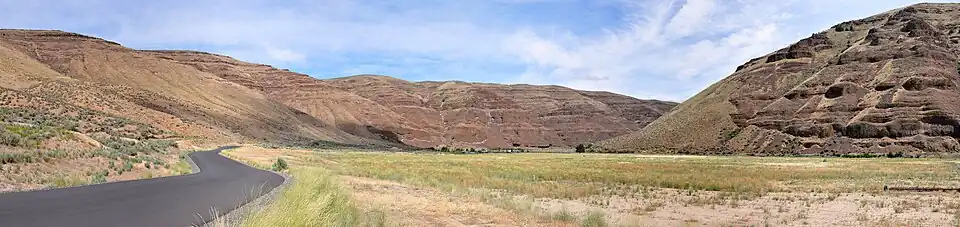 Park headquarters, about a two-hour drive east of Portland, is adjacent to Oregon Route 206 between Wasco and Condon.[1] The river, which here forms the boundary between Sherman County on the west and Gilliam County on the east, meanders for 16 miles (26 km) through the arid park.[2]