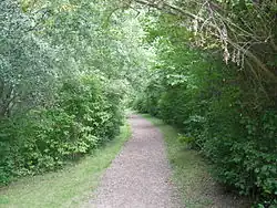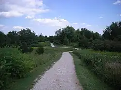 Malletts Creek is a tributary of the Huron River and the most substantial waterway in the City of Ann Arbor at a length of 4.7 miles (7.6 km).[11][12] A tributary of Maletts Creek flows through County Farm Park, and in 2011 and 2012 a portion of this tributary within the park was converted into a three-acre wet meadow with native vegetation.[6][12][13] The conversion was part of a larger Malletts Creek restoration project that cost $2.8 million and resulted in the accidental death of an excavator operator, although it was successful in mitigating the threat of erosion to the creek and reducing the amount of phosphorus that flowed through it and into the Huron River by 25 percent.[6]