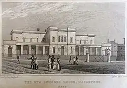 The original Sessions House, which was designed by Sir Robert Smirke in the Greek Revival style, was completed in 1824.[1] The original design involved a symmetrical main frontage facing south west; the central section of three bays featured an arched doorway with a fanlight flanked by two narrow windows and there was a triple window on the first floor; the end bays of the central section slightly projected forwards.[1] The building was initially used as a facility for dispensing justice but, following the implementation of the Local Government Act 1888, which established county councils in every county, it also became the offices and meeting place for Kent County Council.[2] Internally, the principal room in the Sessions House was the council chamber.[3]
