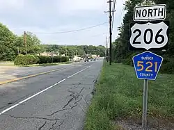 The concurrent US 206 and CR 521 heads into Sandyston Township, where it crosses the Appalachian Trail at Culvers Gap in Kittatinny Mountain and passes through the mountainous Stokes State Forest. After heading north with a three-lane stretch that has two southbound lanes and one northbound lane, the two-lane road reaches a junction with CR 560. After this intersection, the road leaves the state forest and continues through wooded areas with some commercial establishments. US 206/CR 521 reaches the community of Hainesville, where it passes through more agricultural surroundings with some development. Leaving Hainesville, the road continues into Montague Township. Near the community of Montague, CR 521 splits from US 206 by heading to the northeast. At this point, the route runs along forested River Road, running a short distance southeast of the Delaware River. Along this stretch, the road passes a few farms and homes. CR 521 comes to its northern terminus at the New York border, where the road is less than 250 feet away from an I-84 underpass. The road continues north to Port Jervis, New York as CR 16.[1][2]