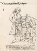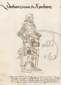 • Conrad of Kirchberg: Konrad is shown on the miniature 24r of the Codex Manesse as a knight (Graue Chunrat vo Kilchberg) who is giving his beloved a poem on horseback. 22 stanzas have survived, divided into three summer and three winter songs, which are reminiscent of Neidhart and Tannhäuser in terms of motif and form.[7] The historical person is uncertain; it is either Konrad (documented between 1255 and 1268) or his son of the same name (documented between 1286 and 1315).[7]
