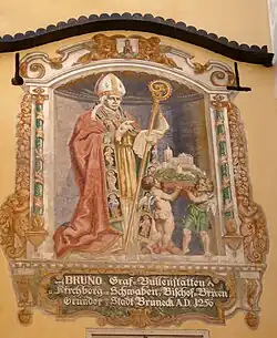 • Bruno of Kirchberg, Bishop of Brixen: Bruno's father was most likely Conrad I, Count of Kirchberg. The tradition from Brixen is likely to apply, since both Bruno's brothers Conrad II and Eberhard III of Kirchberg named their firstborn Conrad. According to the necrologists from Stams and Brixen, his mother's name was Bertha. She came from the family of the House of Gorizia. It could be the daughter of Engelbert III, Count of Gorizia (unnamed in 1206 (Strasbourg/Carinthia) in the Gurk historical sources) and Matilda of Andechs. Mathilde's sister was also called Bertha (Abbess of Gerbstett). This would make Bruno's mother a sister of Meinhard III of Gorizia. Presumably through this connection with the people of Gorizia, Bruno came to the cathedral school in Brixen as a child; on the occasion of a certification in Lyon (5 July 1274) he thanks for the education there. Bruno was originally for the bishopric in Trent, which he had to renounce after papal intervention. From 1250 until his death on 24 August 1288 he was bishop of Brixen. The founding of the city of Bruneck and the construction or expansion of Bruneck Castle can be traced back to him. The city's name is variously derived from his first name.[8] He is also a co-founder of the Cistercian Abbey of Stams in the Inn Valley.[9]