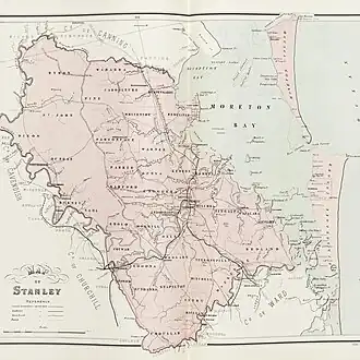 Stanley was formerly a county in New South Wales between the establishment of Brisbane in 1826, and the formation of Queensland as a separate colony in 1859, and was officially established by proclamation on 27 February 1843. It was generally understood (though only somewhat formally defined) to include the land between the 27th and 28th parallels of latitude, Moreton Bay and the western ranges, covering an area of 1,724 square miles (4,470 km2 ).[ 2] In 1852 it had a population of 2,000. Wheat , coffee , cotton and tobacco were described as being important crops. By 1863, the county had contracted to its present boundaries.