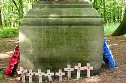 There is a monument in the wood to the crew of LW579. It is a stone plinth from Lincoln Cathedral,[9] now with the men's names inscribed upon it. In 2015 BBC Radio Oxford broadcast a documentary about the crash, the crew and some of their surviving relatives.[10]