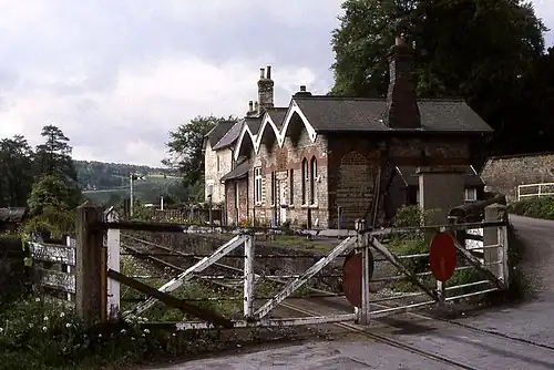 At the north end was a level crossing which, being on the apex of a triangular road junction, was unusual in having three sets of gates. Approximately 14 mile (0.4 km) further on there was yet another level crossing.