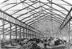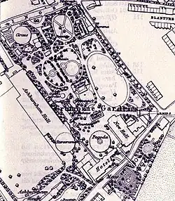 The property was sold by the Dawson family, Barons Cremorne, in 1831 to a Baron de Berenger,[3] who was a convicted fraudster whose real name was Charles Random. De Berenger converted the site into a sports facility, called The Stadium, and became a proponent of self-defence techniques.[4] The business failed in 1843, but not before de Berenger had added some attractions of pleasure gardens of the time, including hosting a balloon ascent in 1838. For two years the gardens opened for summer, including an opening festival billed as "Pie de Nie" with Balloon ascent,[5] for instance, were held, and the property was sold in 1845. James Ellis took over the license in January 1845.[6] The twelve-acre site was then developed by James Ellis into a proprietary place of entertainment and spectacle, being popular as such from 1845 to 1877. The Cremorne Gardens occupied a large site running between the Thames and the King's Road. Opened in 1845, they were noisy and colourful pleasure gardens featuring restaurants, entertainments, dancing and balloon ascents, and could be entered from the north gate on Kings Road or another by the Cremorne Pier on the river.