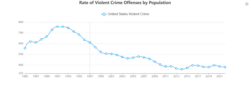 Crime has been recorded in the United States since its founding and has fluctuated significantly over time. Most available data underestimate crime before the 1930s (due to incomplete datasets and other factors), giving the false impression that crime was low in the early 1900s and had a sharp rise after.[1] Instead, violent crime during the colonial period was likely three times higher than the highest modern rates in the data currently available, and crime had been on the decline since colonial times.[2] Within the better data for crime reporting and recording available starting in the 1930s, crime reached its broad, bulging modern peak between the 1970s and early 1990s. After 1992, crime rates have generally trended downwards each year, with the exceptions of a slight increase in property crimes in 2001 and increases in violent crimes in 2005–2006, 2014–2016 and 2020–2021.[3] As of July 1, 2024 violent crime was down and homicides were on pace to drop to 2015 levels by the end of the year.[4][5]