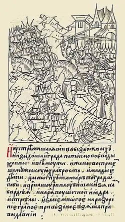 The ongoing siege of Tula worried Ivan, he decided to carry out a false maneuver in order to gain time for the city, he pretended that his entire army was going to Tula, which forced the khan to temporarily retreat, in fact, only a fast detachment of Prince Vorotynsky and went to the Tatars.[8] The main actions took place between June 22 and 23, on the first day 15,000 Russian troops attacked 30,000 Crimean troops directly near Tula and held the victory, the persecution was organized only by advanced detachments. In the battle, Prince Kurbsky received several severe wounds.[9] On the second day, the Russians were successful again in the rearguard action on Shivron, they captured the Khan's convoy, freeing all the prisoners captured earlier in the vicinity of Tula.[10] Two heavy defeats forced the Crimeans to completely abandon their plans for Kazan, the skillful actions of a weaker Russian detachment allowed the main forces to prepare for a heavy and long siege, which ended with the capture of the city on October 2.[11]