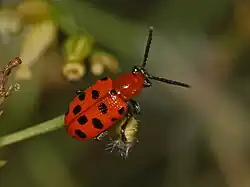 Crioceris duodecimpunctata or the spotted asparagus beetle is a species of shining leaf beetle belonging to the family Chrysomelidae, subfamily Criocerinae.