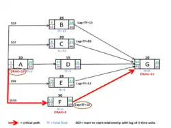 In network schedules that include start-to-start (SS), finish-to-finish (FF) and start-to-finish (SF) relationships and lags, drag computation can be quite complex, often requiring either the decomposition of critical path activities into their components so as to create all relationships as finish-to-start, or the use of scheduling software that computes critical path drag with complex dependencies. [4]