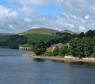 Geologically, the hill consists of Kinder Scout Grit, a kind of sandstone.[4] Both the hill's summits give excellent views of the surrounding countryside with Ladybower Reservoir, Derwent Edge and Win Hill being the main attractions. Between the two summits there is some evidence of an ancient megalithic standing stone circle. The circle originally consisted of five stones around a surviving mound of which only two are still upright.[5][6] There are also scheduled cairns in the vicinity.[7][8]