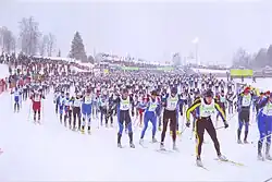 A ski marathon is a long-distance, usually point-to-point race, of more than 40 kilometers; some are held concurrent with shorter races and participation is usually open to the public. In Norwegian, such a race is called turrenn ("ski touring race").[5] Major events have more than 10,000 participants where mass starts often have a modified starting order by groupings of participants—who have been judged to be of similar ability, beginning with the elite skiers group and ending with a group of the least experienced skiers.[15] Skiers can use either classic or skate-skiing techniques, depending on the rules of the race. Awards are usually based on overall placement, placement by sex of athlete, and by age category.[15] There are two major series in this category, the Ski Classics and the Worldloppet.