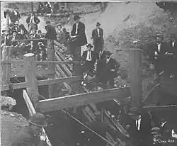 Major mining operations began at the Cross Mountain Mine in 1888, when a railroad spur line was extended up the Coal Creek Valley and into Slatestone Hollow. Over the years, large amounts of volatile coal dust had accumulated in the mine's shafts. On the morning of December 9, 1911, a roof fall occurred near one of the mine's entrances, which released methane gas into the air. The methane gas and coal dust ignited when a miner approached the roof fall with an open oil lamp. The explosion killed or trapped the 89 miners who had gone into the mine that morning.[2][1][7] The miners' ages ranged from 16 to 61.[2] The casualties included concussions due to the explosion and suffocation from the afterdamp.[2]