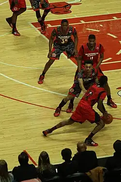 A crossover dribble is a basketball maneuver in which a player dribbling the ball switches the ball rapidly from one hand to the other, to make a change in direction.[1] In a typical example the player heads up-court, dribbling the ball in (say) the left hand, then makes a wide step left with a head fake. If the defender is deceived, the player can then switch to dribbling with the right hand and surpass the defender. The crossover can allow the player an open jump shot or a clear path to the basket. Crossover is generally performed for space creation.