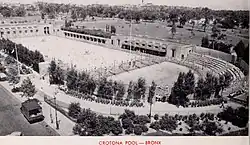 Plans for the construction of ten tennis courts, a new playground, and additional handball courts and baseball diamonds at Crotona Park were announced in May 1934.[40] Construction for some of the 11 pools began that October.[38][41] Of these, Crotona Park was the only location in the Bronx where a WPA pool would be constructed.[36][42] A 110-foot-square (34 m) wading pool had opened to the north of the future bathhouse site by mid-1935.[38] The blueprints for the Crotona Park pool and bathhouse were submitted to the New York City Department of Buildings that August.[43] By mid-1936, ten of the eleven WPA-funded pools were completed and were being opened at a rate of one per week.[32] The Crotona Pool was the seventh of these pools to open.[44][45][a] It opened on July 25, 1936, in front of a crowd of five thousand; according to The New York Times, about 10,000 would-be participants had to be refused entry.[42] The center was composed of the 330-by-125-foot (101 by 38 m) main swimming pool, a bathhouse, and the wading pool to the north of the bathhouse.[46]