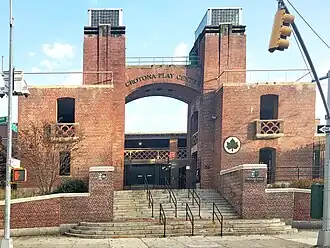 The main entrance contains a stair, spanned by a very large arched brick gateway overlooked by towers with glass-block skylights.[114][117] There are lanterns within the skylights atop each tower.[83] Along the arch are bronze letters spelling crotona play center. A cornerstone at the base of the north tower reads a.d. 1936.[117] The stairway contains brick sidewalls. At the top of the stair is a brick courtyard which is enclosed by a two-story structure with a second story balcony.[87] In the entrance foyer just east of the courtyard, there were booths that sold tickets for the bathhouse; the ticket booths are now closed since the bathhouse is free to use.[117] An overpass projects from the southern facade of the courtyard building, connecting to a brick first-aid station.[118]