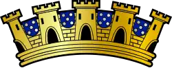 Whereas most county councils in England use mural crowns, there is a special type of crown that was used by Scottish county councils. It was composed of spikes, was normally shown vert (green) and had golden wheat sheaves between the spikes.[2] Today, most of the Scottish unitary authorities still use this "wheat sheaf crown", but it is now the usual gold.