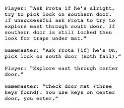 Players begin by generating a character with various attributes including Constitution, Intelligence, Dexterity, Charisma, Luck, Perception, and Strength.[3] Players could choose three skills which included: "Map reading, Traps/Maze, Language, Diplomacy, Swim, Animal/Bird, Boat/Fish, Mineral/Gem. Climbing, Gambling, Survival, Armor, Shield, Axe, Armor Repair and Weapon Repair".[7] Players had two character types available, warrior or wizard, assigning one as dominant.[4] Players advanced levels by amassing experience points and testing at their guild in a walled city.[8] Turn orders were simple: players wrote orders in sentence form for the gamemaster (image right).[6]