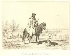 The csikós (Hungarian pronunciation: [ˈt͡ʃikoːʃ], singular) is a horse-mounted herdsman of Hungary. The csikós tradition is closely associated with the Hungarian puszta, the temperate grasslands of the Great Hungarian Plain, which encompasses the largest stretches of the greater Pannonian Basin. In recent times, csikós have been particularly tied to the environs of Debrecen and Hortobágy National Park, the latter deploying csikós to watch over and maintain large herds of free-ranging native Hungarian ungulate breeds, including cattle, horses and sheep. The csikós tradition is also tied to the Nonius, a breed of horse with an epicentre of breeding in the Máta Stud, located some 3 kilometres from Hortobágy.[1]