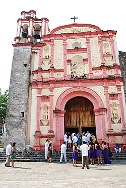 The next most important chapel in the complex is the Tercera Orden Chapel (Capilla de la Tercera Orden), built the northwest corner of the complex in 1722 by Enrique de Jeres, a Franciscan friar. It would later have a seminary installed in one of its annexes by the first bishop of Cuernavaca, which would become one of the most important educational institutions in the city in the 19th century.[6] This chapel was constructed in a style called popular Baroque along with Churriguersque. The facade has sculptures of angels and saints, some with indigenous headdresses. The bell tower has two levels but it is not tall. The portal on the south side is topped with a seashell formation.[8] Inside, it has a Latin cross layout with one name, divided into an upper choir, nave and apse.[6] The main altar is Baroque, profusely decorated with colorful flowers, angel and saints. This altar was constructed by indigenous craftsmen.[8]