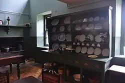 Potatoes were a staple garden vegetable and would be roasted or boiled. One example of a potato dish which Tibbott has recorded is called Cig ar wyneb tato, this is a dish of roast potatoes (Tato Rhost) where the potatoes are part boiled in a heavy saucepan and then covered with bacon rashers, with a thick layer of chopped onions or chives placed on top. The pan is covered with a closely fitting lid and cooked with a little water for half an hour, so that the bacon fat browns the potatoes at the bottom of the pan. On churning day the dish would be served with buttermilk (Tato rhost a llaeth enwyn). The meal is cooked without the need for much supervision and was usually made in a ffwrn fach over an open fire.[27]